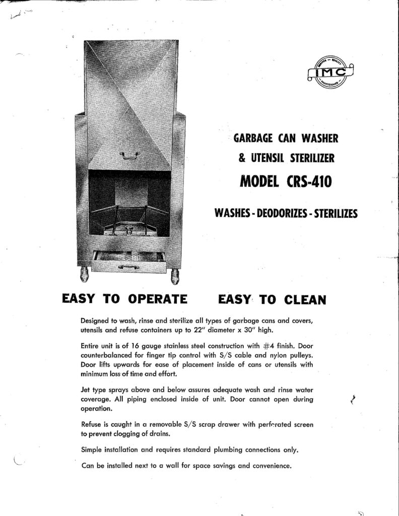 Continuing with our expedition into the past, we’ve uncovered a truly historical product that was a predecessor to the previously mentioned can washer. The product is Model #CRS-410 Garbage Can Washer & Utensil Sterilizer – and it is quite an interesting one! What was it & what purpose did it serve?