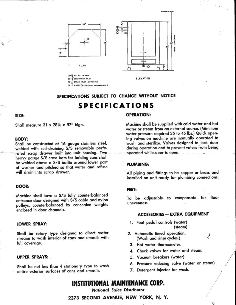 The product also came with an interesting assortment of optional accessories such as a detergent injector, timer, various thermometers & a pressure valve. Here is a look at the original spec sheet: