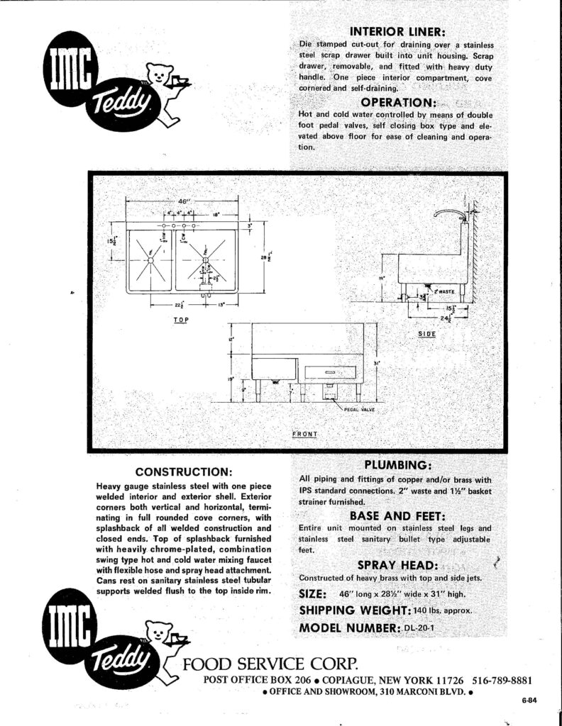 Aside from these minor differences, Model #DL20-1’s design remains iconic. The dual sink design with high backsplash has given it a unique identity in the foodservice industry.