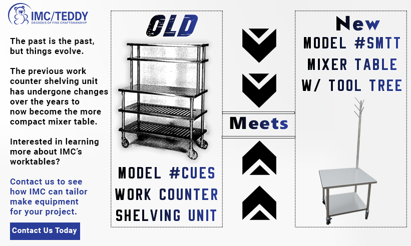 As you may have noticed, the product is no longer available in IMC’s catalog, however several successors have come forth from this one item. In particular, mixer tables (Model #SMTT) equipped with a tool tree & an additional undershelf seems to be the logical replacement. Mixer tables can serve as temporary storage tools & a work top – which fulfills the functions of the original work counter shelving unit. Mixer tables are also more compact, but the size may be customized to meet your requirements.