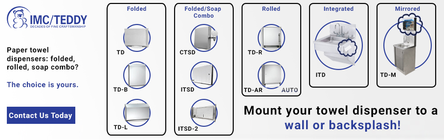 At IMC/Teddy, we manufacture paper towel dispensers that are compatible with both folded & rolled paper types. Plus, many of these can be mounted on a backsplash for added convenience. For our complete paper towel dispensers offerings, please check here.